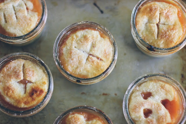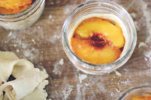 I open the door to my home and the smell of warm peaches filter past, spilling off the front porch into the cool, crisp air. You were thinking I’d do pears, or apples, but I tell you I couldn’t resist that last crate of peaches at the co-op, and that I was missing my dear Grandma Ethel, who made the tastiest peach pie this side of the Mississippi. You sit down while Ella Fitzgerald sings soft and sweet, and I fill your cup full of deep, dark coffee while your foot taps along to the music. We talk slowly at first, with purposeful questions, but soon we pick up speed, feeling comfortable glimpsing into other worlds. We eat together, our tiny jar pies disappearing quickly, the sweet peaches giving us all one more day of summer to hold on to. Little hands and eyes peek over the table, shyly wanting to meet everyone, and also hoping for tiny pies of their own. They are given what they’ve asked for, with smiles all around. We move on to topics of food, and cookbooks, while exclaiming frequently how amazing this modern world is, how we are all sitting here together, each of us from so far away. There is a break, our spoons rattle and clang around our jars, our cups are stained black but empty. Ms. Fitzgerald is now whispering, lamenting so quietly that our time is up, we must move on, get back. And so, the door opens and closes again. I pick up the jars, and spoons, and cups and bring them to the sink. Drifting, dreaming in an azure mood I sing along with Ella. Stardust gleaming, through my solitude. There is one pie left, forgotten on the counter. I put the jar in the fridge, thinking of how tomorrow, somehow, I will eat it alone, yet still be near {just a click away!} to so many good souls.