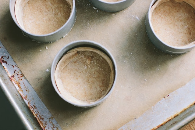 After the dough has been chilled, roll one round out very thin, about 1/8-1/4 inch thick. Use the tart ring to cut out a circle, which will be the bottom of your crust. Place the tart ring on the lined baking sheet, and put the circle of dough in the ring, on the parchment paper. Next cut a one inch thick strip from the dough, 9-10 inches long, and line the inside of the tart ring, making sure the strip is touching the bottom circle (this may seem a little hodgepodge; you may have to piece some strips together a bit when you line the tart ring to make them long enough. But you will have enough dough, and they will still look pretty when baked). Press gently into the sides of the ring. Repeat with remaining tart rings. With a fork, prick small holes on the bottom of the crust. Chill in the refrigerator for 20 minutes.