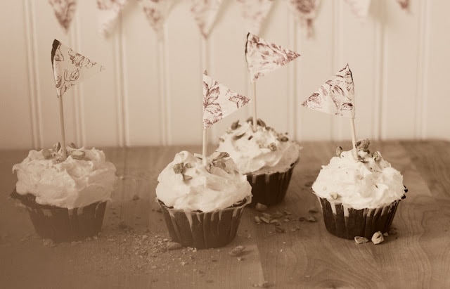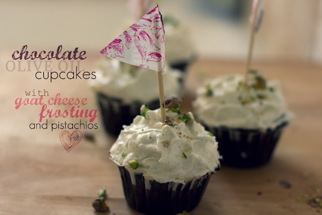 Chocolate Olive Oil Cupcakes with Goat Cheese Frosting and Pistachios