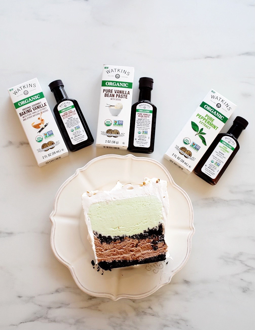 I’ve used Watkins Organic Original Gourmet Baking Vanilla for both the chocolate and peppermint ice creams. Unlike high-alcohol vanilla extracts, the Baking Vanilla doesn’t evaporate when baking or freezing, which helps retain its delicious flavor. It’s a perfect choice for this ice cream dessert, and any other holiday baking as well, like cake, pies, cookies, and crème brulee.