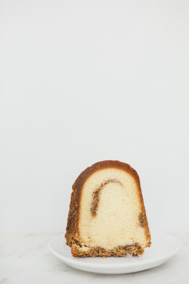 You’ll find a layer of cinnamon streusel swirled through the vanilla cake, and another layer on the bottom of each piece.