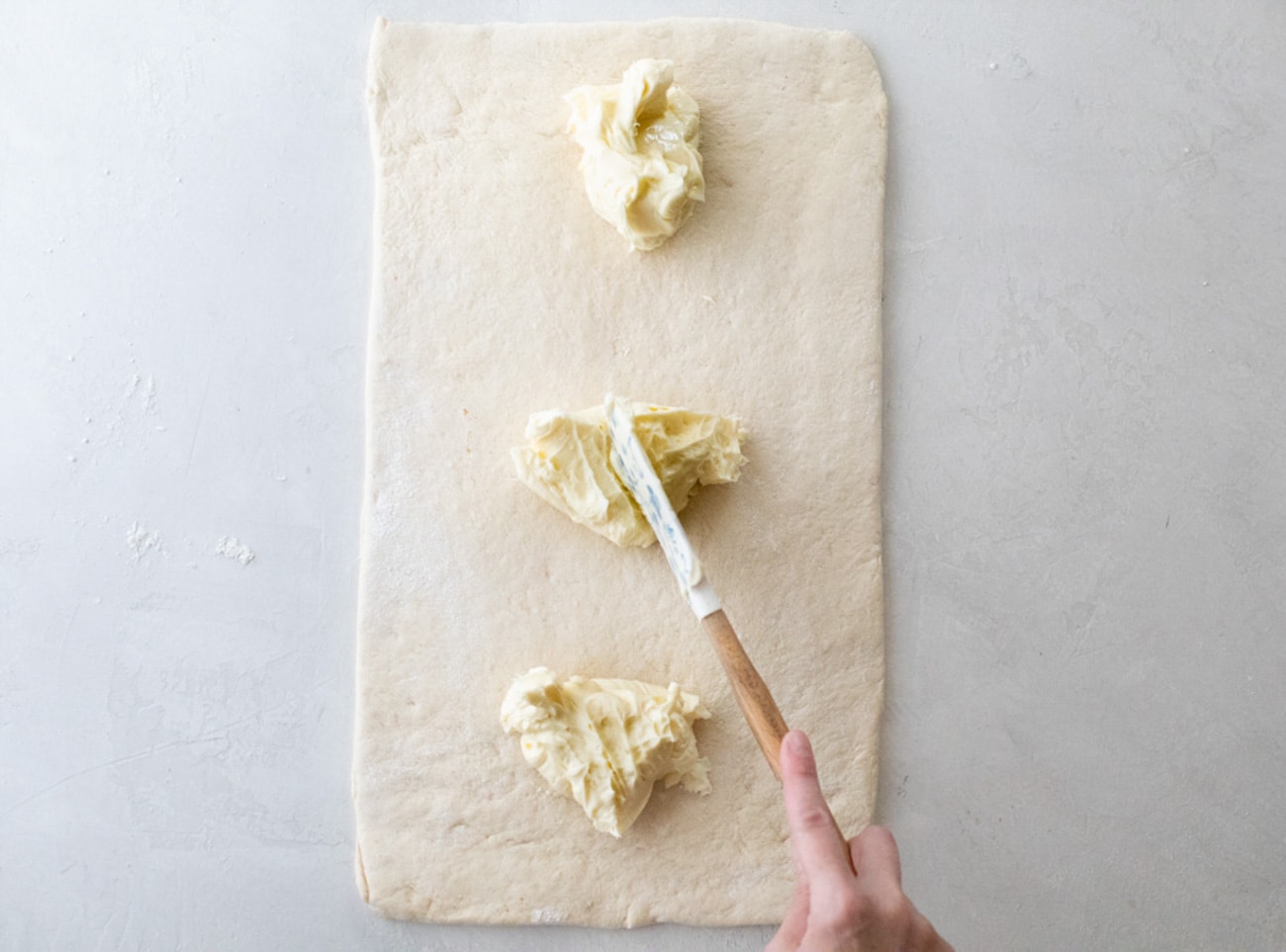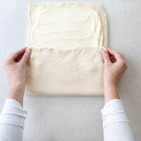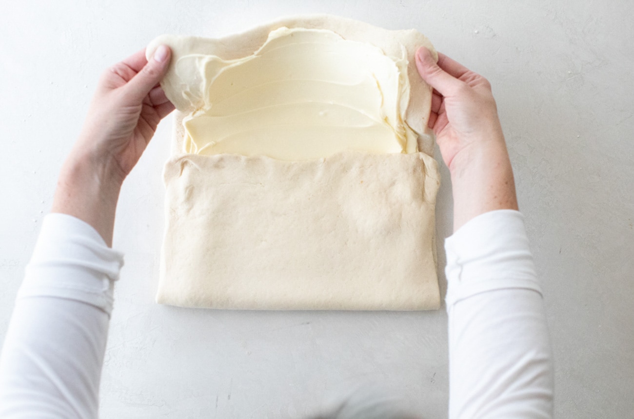 Traditionally, croissant doughs have a butter block (or beurrage) encased in the center of the dough. For this cheater recipe, you’ll take the butter and spread it over the rolled-out dough, and then proceed with folding the dough (or turns). This helps the dough come together a little faster, and the dough rolls out beautifully. It makes a really delicious, flaky pastry.
