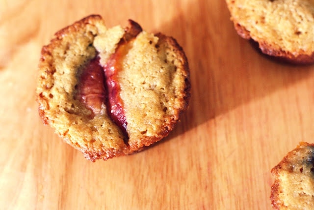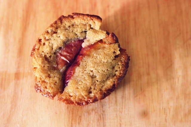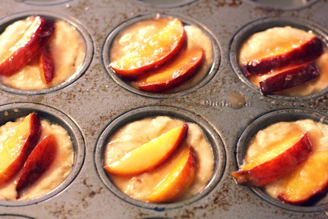 Scoop the batter into the prepared muffin cups. Fill each muffin cup so that it is slightly rounded over the top. Lay one slice of peach over each muffin, tucking a second slice over the first one and partway into the batter. Bake for 25 minutes, rotating the pans half way through baking. Cool in the pans for five minutes before turning them upside down to remove muffins.