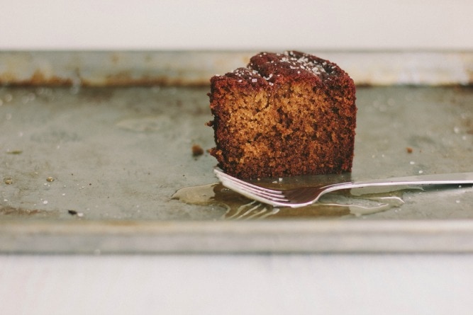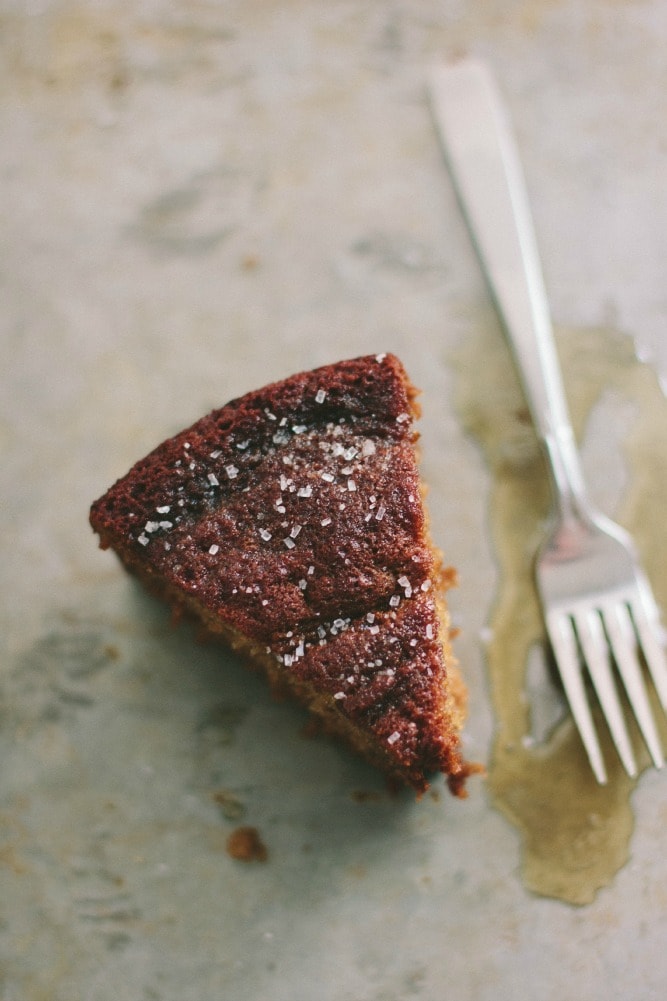 The texture of this cake reminds me of this bread, which is one of my favorites, but one I like best with nuts. Next time around, I would add 1 1/2 cups of almonds, or pecans, or walnuts here. Also, cacao nibs? I feel I’ve been overusing them, but I would probably throw those in. And, I didn’t brush the sides with the warm honey initially [only the top] and highly regretted it. That sticky-salty topping is the very best part of this cake. So go for it. [You can sprinkle some sanding sugar on top along with the salt, if you want to balance the saltiness a bit. It makes everything more sparkly, too, which is never a bad thing].