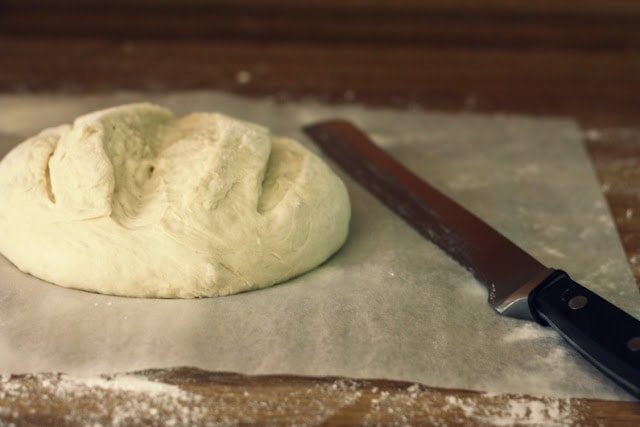 **The dutch oven I personally use is smaller than typical dutch oven. On the website, the authors of the book used a 7 1/4 quart dutch oven for a 1 1/2 pound piece of dough. I put a one pound piece in mine. You many have to adjust cooking times according to the size of your dutch oven – see links in the above italics for help**