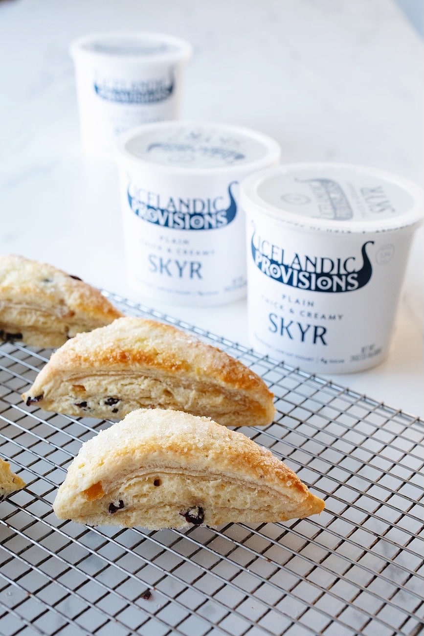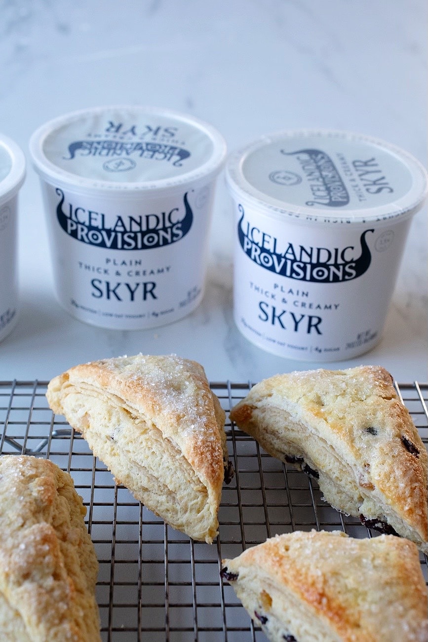 I usually make the base of my scones with crème fraîche or sour cream, but I was happy to discover that skyr works just as well. I made these Panettone scones with Icelandic Provisions Plain Skyr and orange juice (replacing the crème fraîche and heavy cream) and they were absolutely delicious. A mix of dried cherries, apricots, cranberries, pineapple, or candied orange peels (whatever you have in the pantry) are added, along with almond paste for traditional panettone flavors.