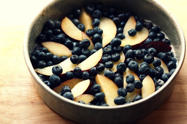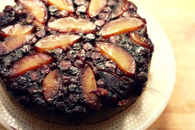 Luckily I had bought plums earlier that day. And there were blueberries left over from the CSA. I always have buttermilk on hand, and cardamom is stocked in my pantry, too. So let’s make a cake: a pretty, tasty, upside-down cake. It’s brilliant purple top will be the highlight of the table, and it will taste as good as it looks. Another every day cake to make life more enjoyable.
