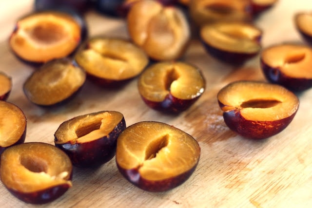 1 pound ripe but firm plums [about 4 standard black ones or 12 smaller Italian plums]