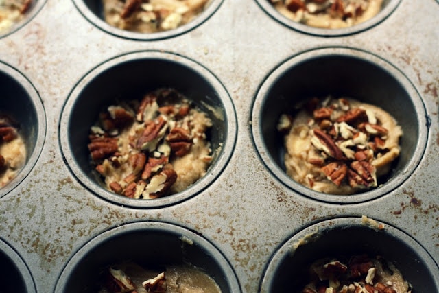 In a large bowl, combine the 12 tablespoons butter, 1/3 cup brown sugar, and salt. Place 1 rounded tablespoon of the mixture in each of the 12 muffin cups., combine the 12 tablespoons butter and 1/3 cup brown sugar. Place 1 rounded tablespoon of the mixture in each of the 12 muffin cups. Distribute the pecans evenly among the 12 muffin cups on top of the butter and sugar mixture.