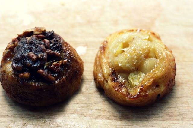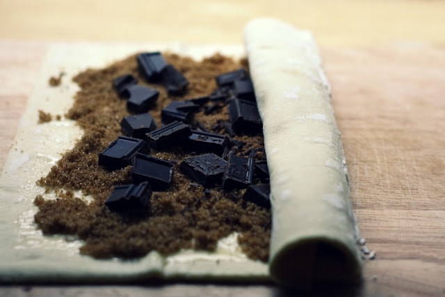 After the pear- crème fraîche buns, I thought a post would be necessary for straight up puff pastry sticky buns. This version is so easy to make, and so tasty. I did sneak some chocolate in there to change things up a bit, but feel free to use raisins or pecans instead.