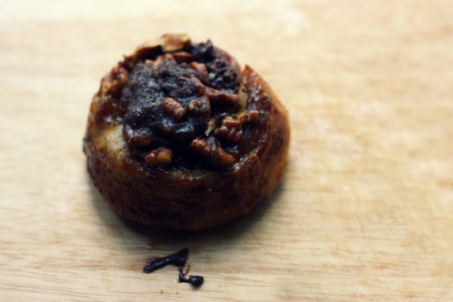 Bake for 20-30 minutes, until the sticky buns are golden to dark brown on top and firm to the touch. Be careful – they’re hot! Allow to cool for 2 minutes only, invert the buns onto the parchment paper [ease the filling and pecans out onto the buns with a spoon] and cool completely.