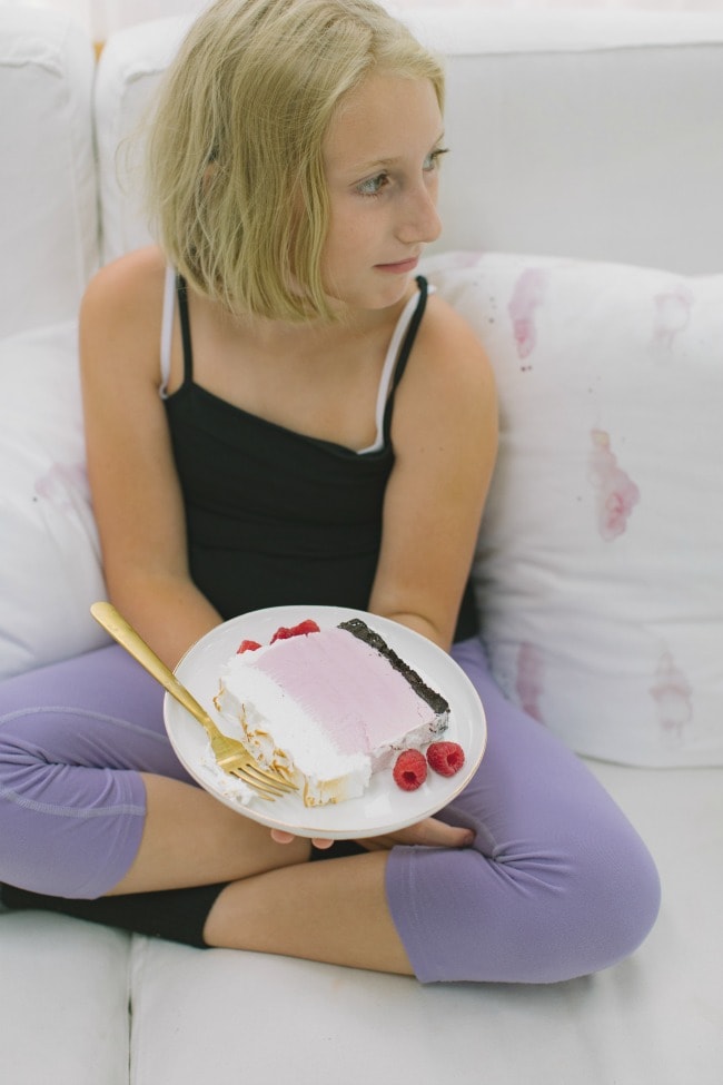 So we made ice cream cake. Because the weather is warm, and we still have days left to celebrate our freedom. Raspberry crème fraîche no-churn ice cream with chocolate cookie crumb and toasted meringue topping, to be exact.