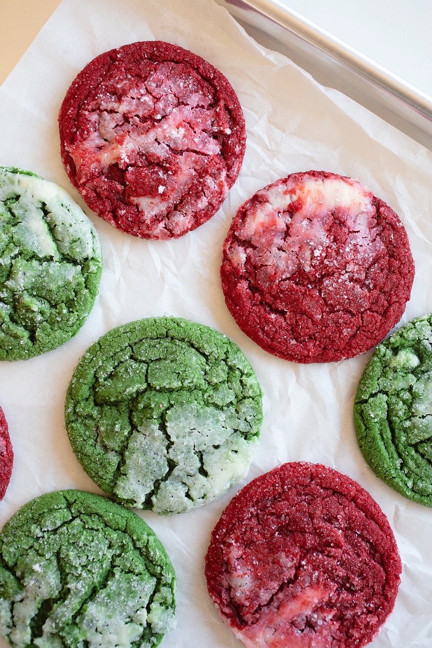 The cookie base is my favorite sugar cookie: soft with crispy edges. It’s vanilla and chocolate, with a hint of cocoa in them for a traditional red velvet taste, and the cream cheese swirl adds a nice creamy bite (as cream cheese frosting is typically used for red velvet cake), and tanginess to cut the sweetness.
