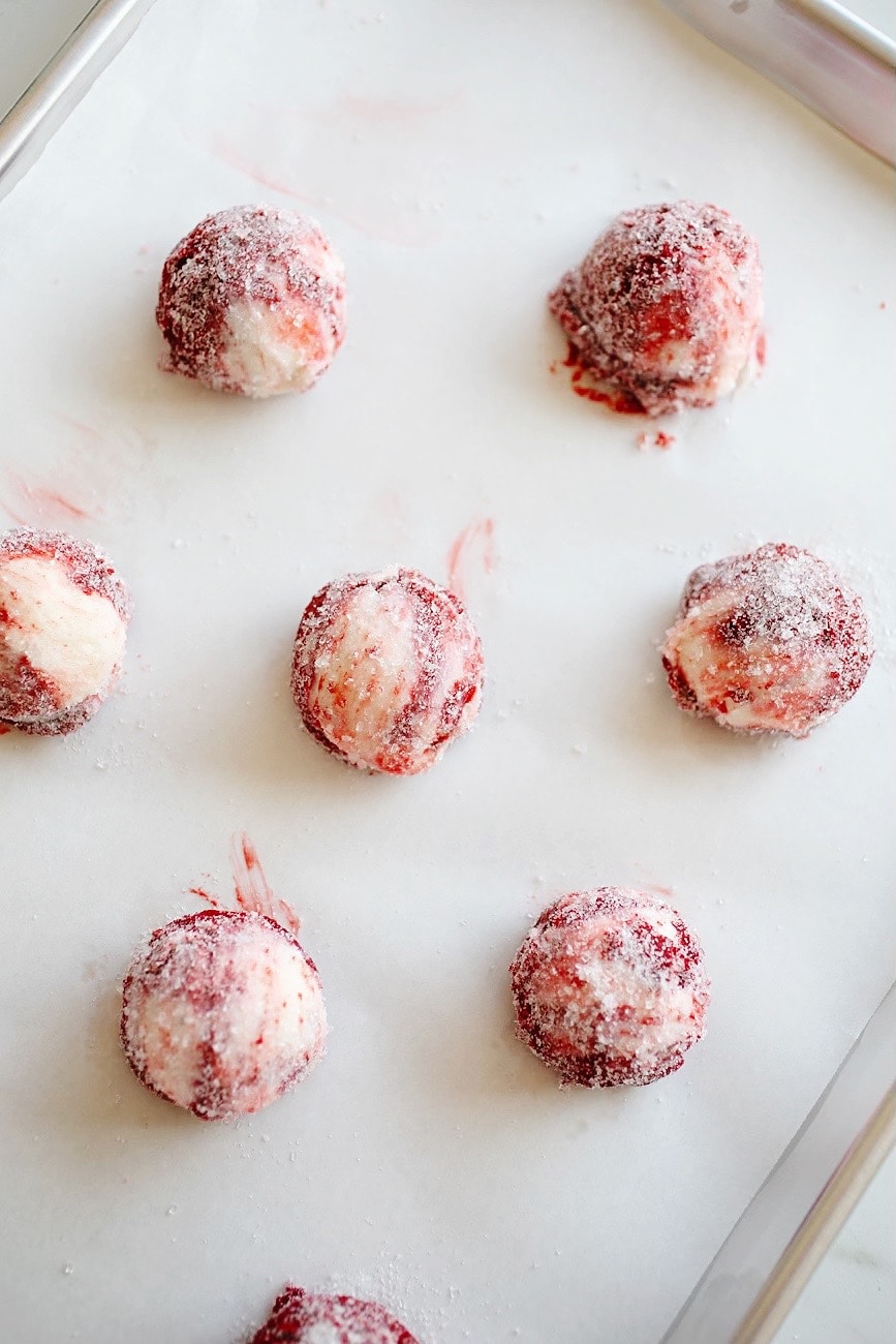 - Place 1 teaspoon of cream cheese in the top of a 1 ½ oz cookie scoop and use the back of spoon to spread it slightly over the inside of the scoop. Fill the scoop with sugar cookie dough (see note below if you don’t have a cookie scoop) and drop the dough into the bowl of sugar. Gently roll the dough around (it may be a bit sticky) to cover, and place on one of the prepared pans. Repeat with the remaining cream cheese and dough, putting 8 cookies on each sheet pan.