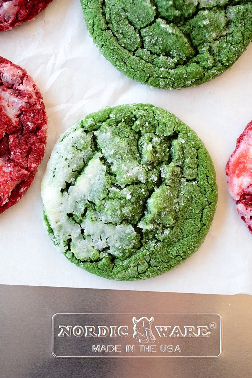 Add 1 teaspoon mint extract (more or less, depending on your preference) along with the pure vanilla extract. Replace the red food coloring with green. I used Wilton’s Leaf Green gel-based food coloring, and was able to keep the cocoa powder in and still keep the cookie a vibrant green color. If you are using a liquid-based green food coloring, you will need to omit the cocoa powder, or your cookies will turn a brownish color.