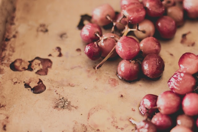 Snip small bunches of grapes and place them on a sheet pan. Cover them lightly with olive oil. Roast at 400 degrees for 20-30 minutes, until the skins have started to wrinkle and the fruits are leaking juice [smaller grapes will not need as much time].