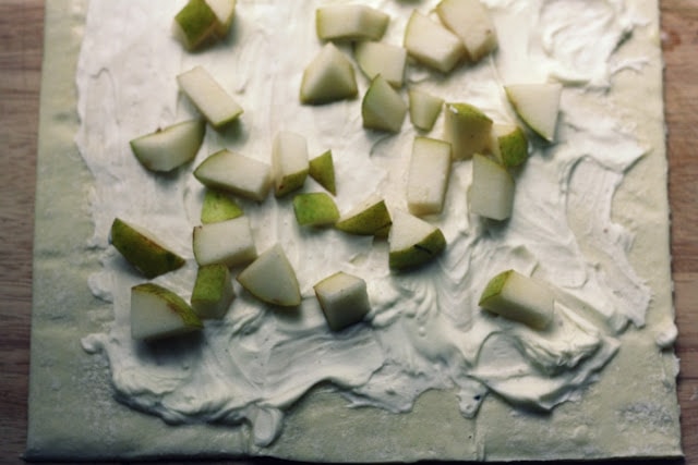 Sometimes inspiration hits slowly. There I was, with a box of puff pastry in my freezer. I had a friend coming over the next morning, so I pulled it out and stuck it in my fridge, racking my brain to come up with something easy to make for breakfast. I had ripe pears in the fruit bowl, and wanted to include them. I remembered my crème fraîche in the fridge, and thought that could be lovely. I fell asleep that night, dreaming of something to make it just right.