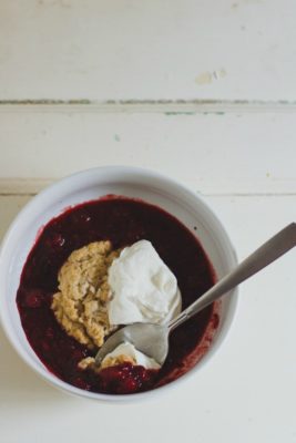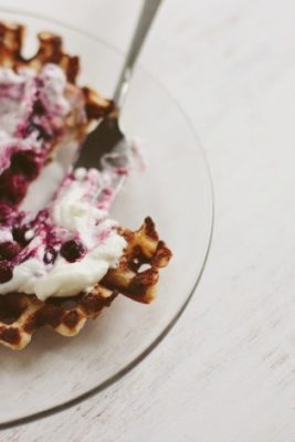 whole wheat waffles with rhubarb-blueberry-cardamom compote