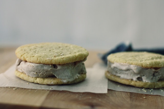 This cookie recipe is adapted from Cooks Illustrated – I just added some toasted sesame oil and toasted sesame seeds. It’s one of my favorite sugar cookie recipes. This recipe makes 12 very large ice cream sandwich cookies – if you want them smaller, roll dough into 48 pieces.