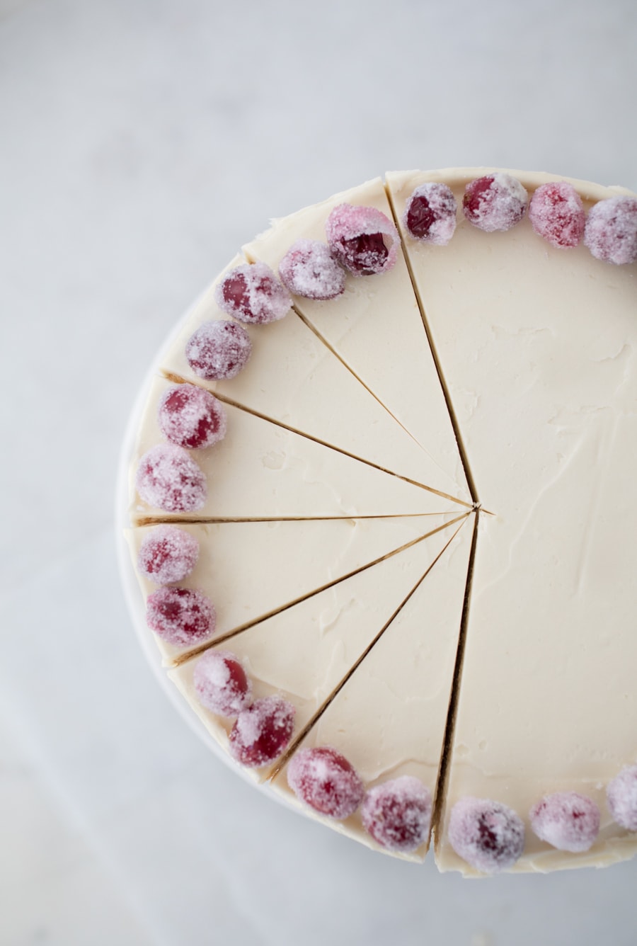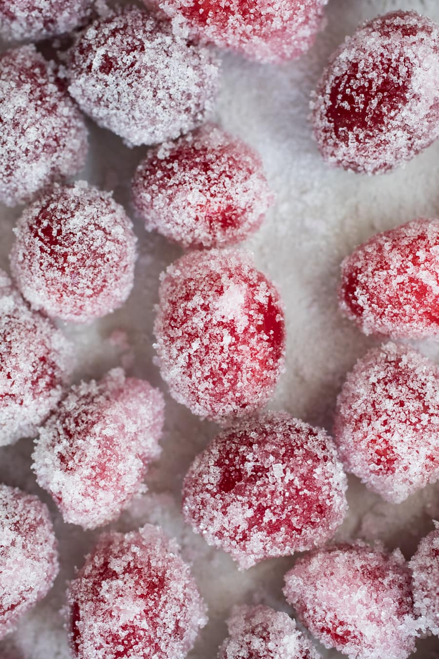 Sugared cranberries are fairly simple to make! The cranberries soak in a simple syrup overnight, then are drained and tossed in more sugar. All this sugar helps tame their tart bite, but also makes a beautiful presentation. I like them for cake tops, but also top my cinnamon rolls with them during the holiday season.